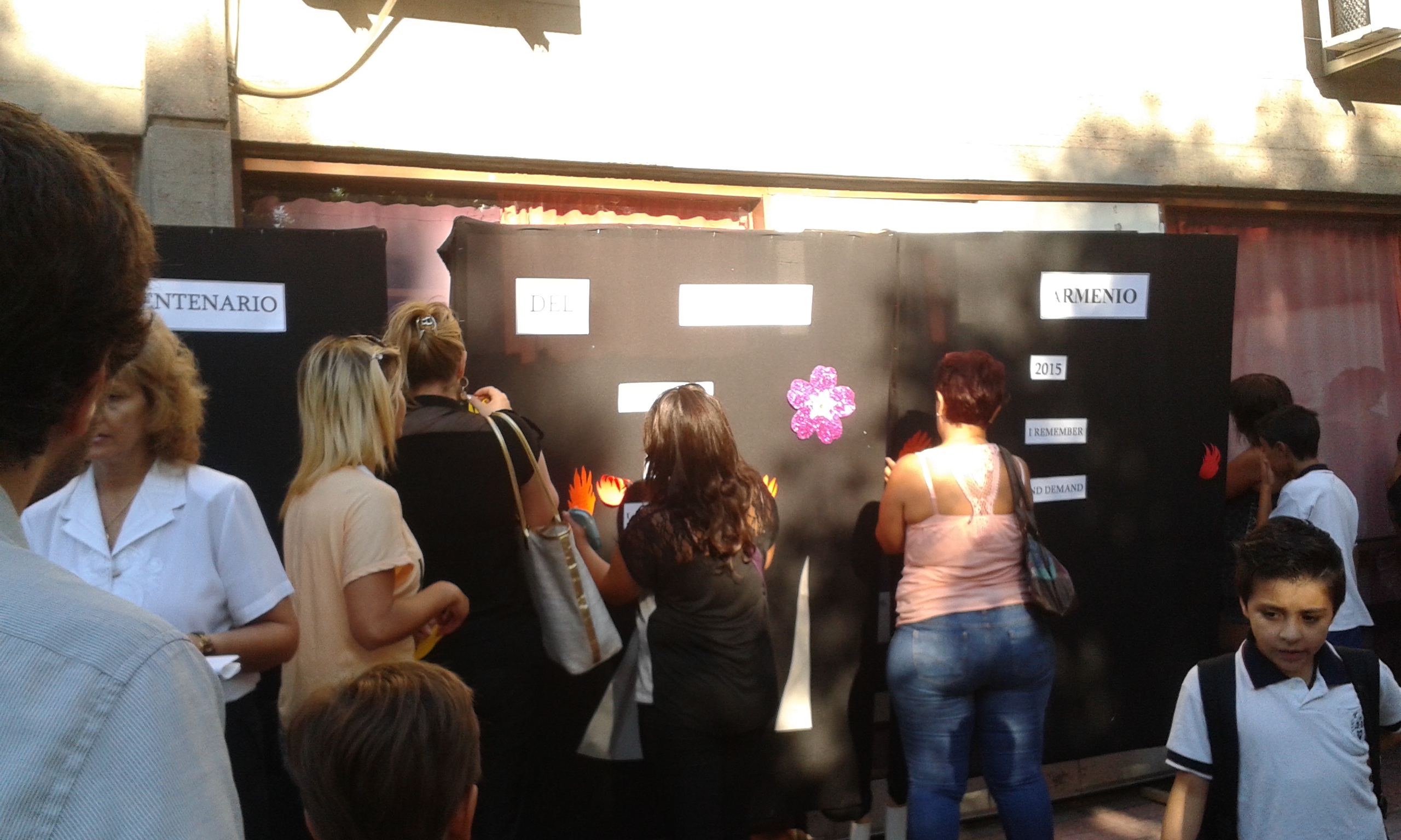 La cartelera con el símbolo de la flor del “No me olvides” (Anmorrug) y los lemas del centenario (Recuerdo y Reclamo) en armenio, español e inglés con el monumento a los mártires de Dzidzernagapert, con el que se recibió a padres y alumnos.